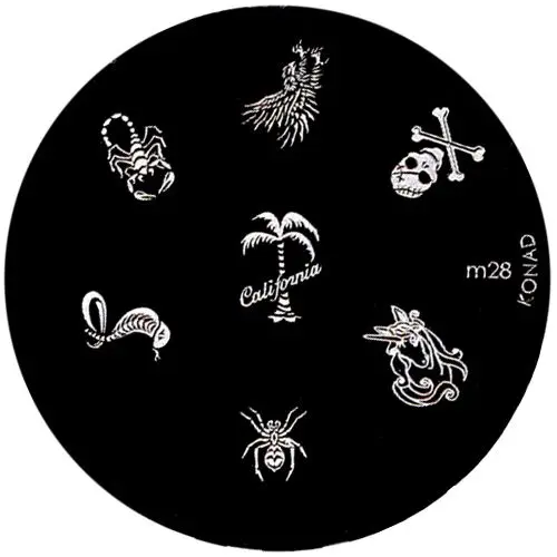 Vzory: jednorožec, pavouk, had - kobra, štír, orel, smrtka a palma s nápisem ,,California".
