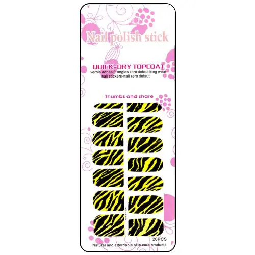 Nálepky na nehty se vzorem zebry v žluto-černém odstínu. Jejich aplikace je rychlá a jednoduchá. Potřebujeme jen nálepky a nůžky. Nejsou nutné žádné znalosti v oblasti nehtové modeláže a nail artu. Vhodné i pro začátečníky.